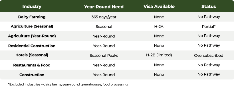 There is simply no visa category in the U.S. federal system designed for a year-round, essential-industry, manual-labor worker.